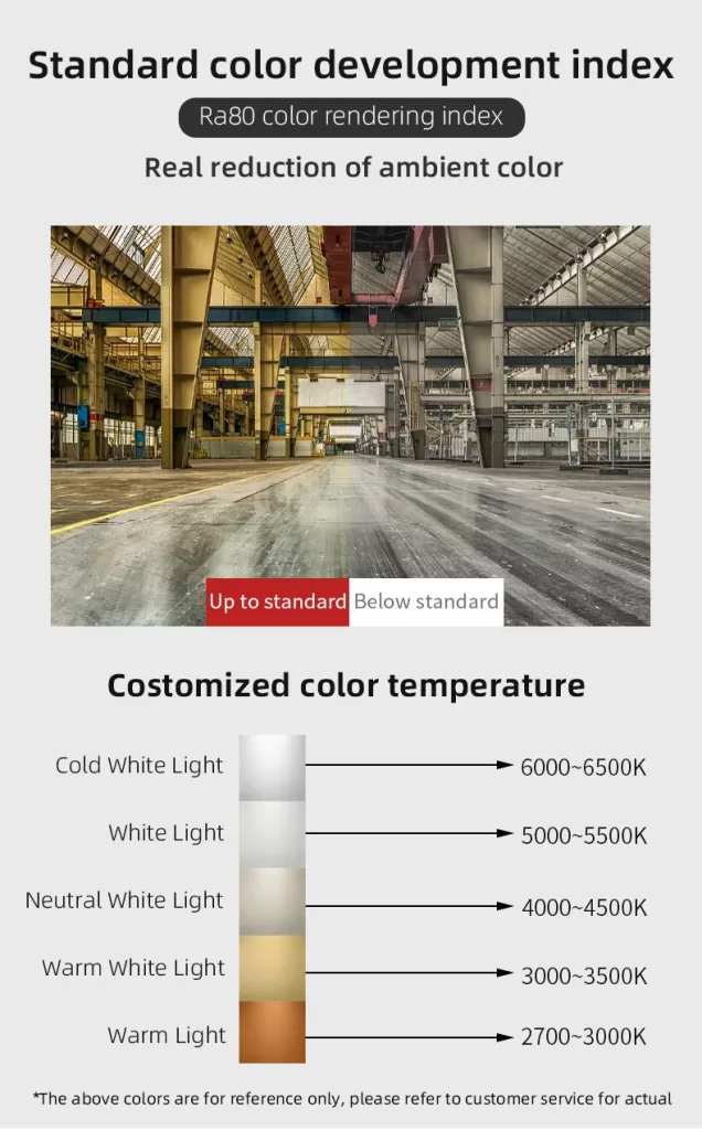 • Excellent Color Rendering: Features a Color Rendering Index (CRI) of ≥80Ra, providing accurate and vibrant color representation, which is beneficial for various industrial processes.